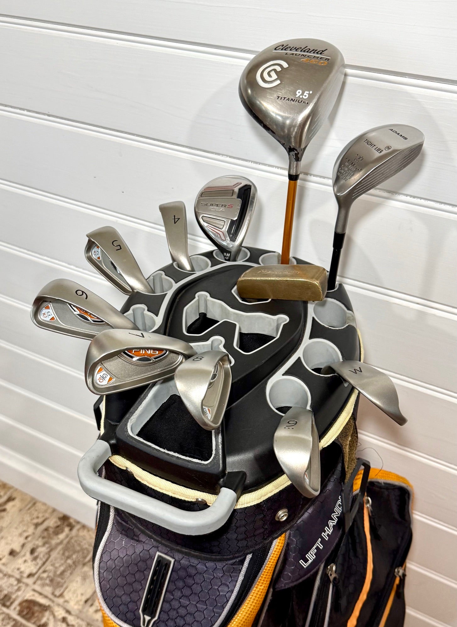 This is a Full Set of Right-Handed, Standard-Length Golf Clubs with a Bag and ready to Play Today. The Irons are PING G10 Black Dot Clubs 4-PW with PING AWT R-Flex steel shafts and PING Grips. All in Excellent Condition. The Driver is a Cleveland Launcher 460 Titanium 9.5 degree club with a Cleveland S-Flex Graphite shaft and Lamkin Grip. The 3 wood is an Adams Tight Lies 16 degree club with an Adams R-Flex Graphite shaft and Lamkin Grip. The Hybrid is an Adams IDEA VST Super S 22 degree 4H with an Adams A-Flex Graphite shaft and Adams Grip. The woods and hybrid have NEW Club Headcovers. The Putter is a Vintage Copper Velvet Touch 700 by Matzie with a steel shaft and NEW Karma Big Softy Grip. All of this comes in a Founders Club Cart Bag with a 14-way divider and loads of storage. This is not your normal bag. A little taller with a dedicated organizer/divider to protect each club. Great Bag. This is an Excellent Set in Excellent Condition at an Excellent Price. See the pics for details and message me with any questions. Thank you. Just $395