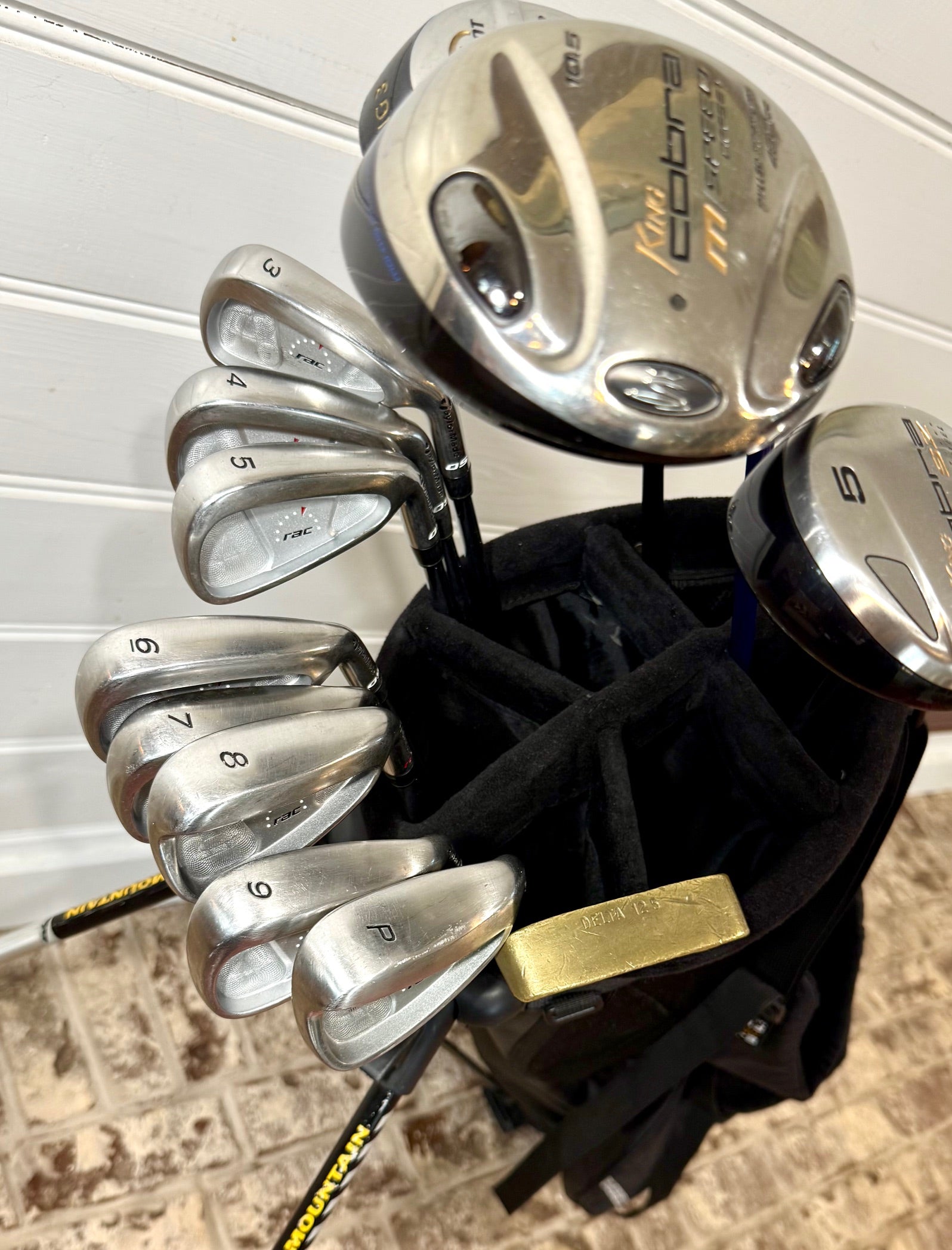 This is a Complete Set of right-handed, standard-length Golf Clubs with a bag and ready to Play Today. The irons are TaylorMade RAC OS clubs 3-PW with TaylorMade R-Flex steel shafts and TaylorMade grips. (8 & PW are HT). The Driver is a King Cobra M-Speed offset 10.5 degree club with a TaylorMade R-Flex Graphite shaft and NEW Champkey Y-Wrap Midsize Grip. The 3 wood is a One Shot 14 degree club with an R-Flex Graphite shaft and same NEW GRIP. The 5 wood is a King Cobra SZ Hyper Steel club with an s-flex steel shaft and same NEW GRIP. The woods and driver have NEW Club Headcovers. The Putter is a Vintage Delta 125 copper club with a steel shaft and NEW Iwinpros Grip. All of this comes in a Sun Mountain Stand Bag with a 6-way divider, backpack harness and plenty of storage. This is an Excellent Set in Excellent Condition at an Excellent Price. See the pics for details and message me with any questions. Thank you. Just $395